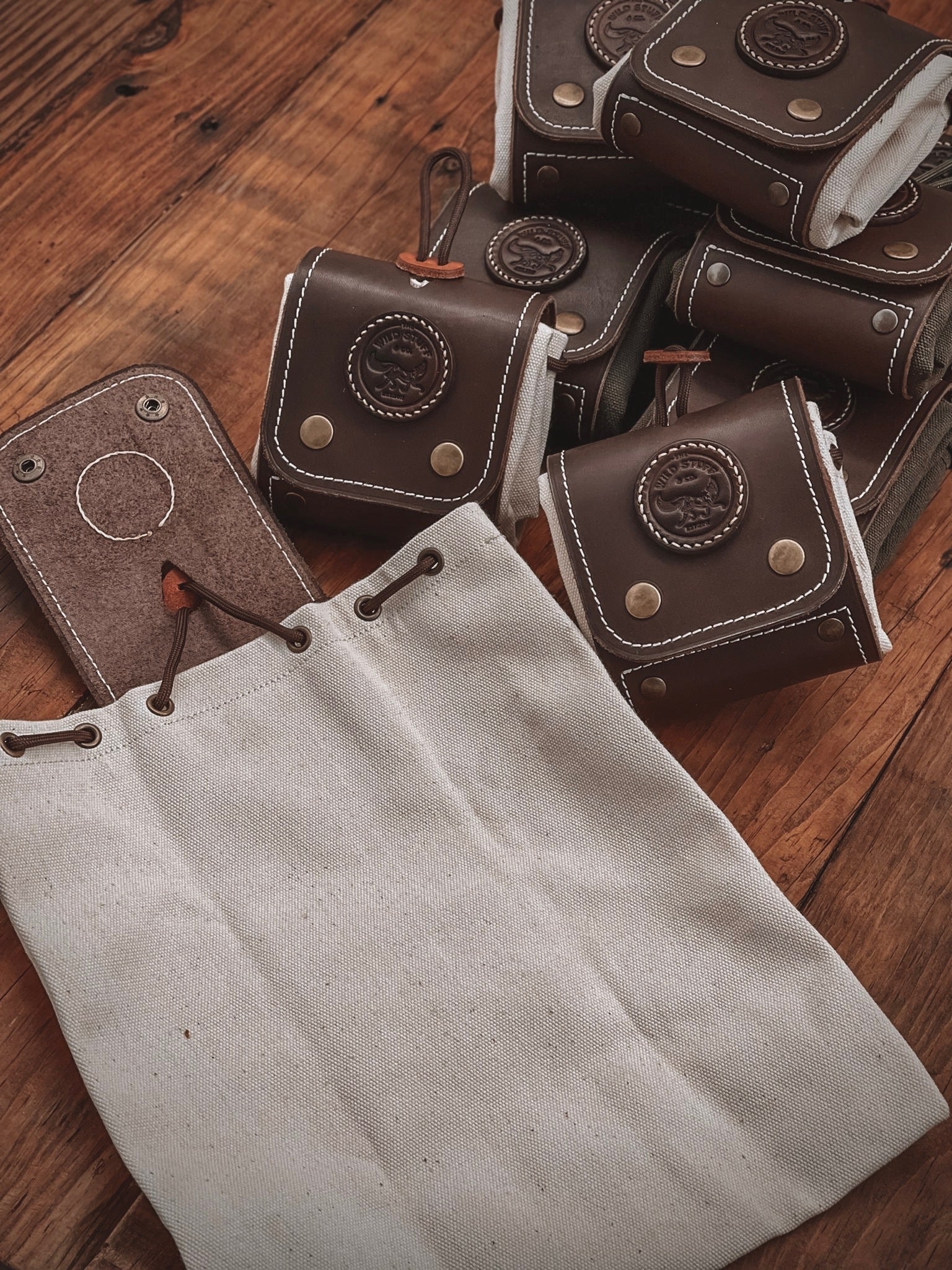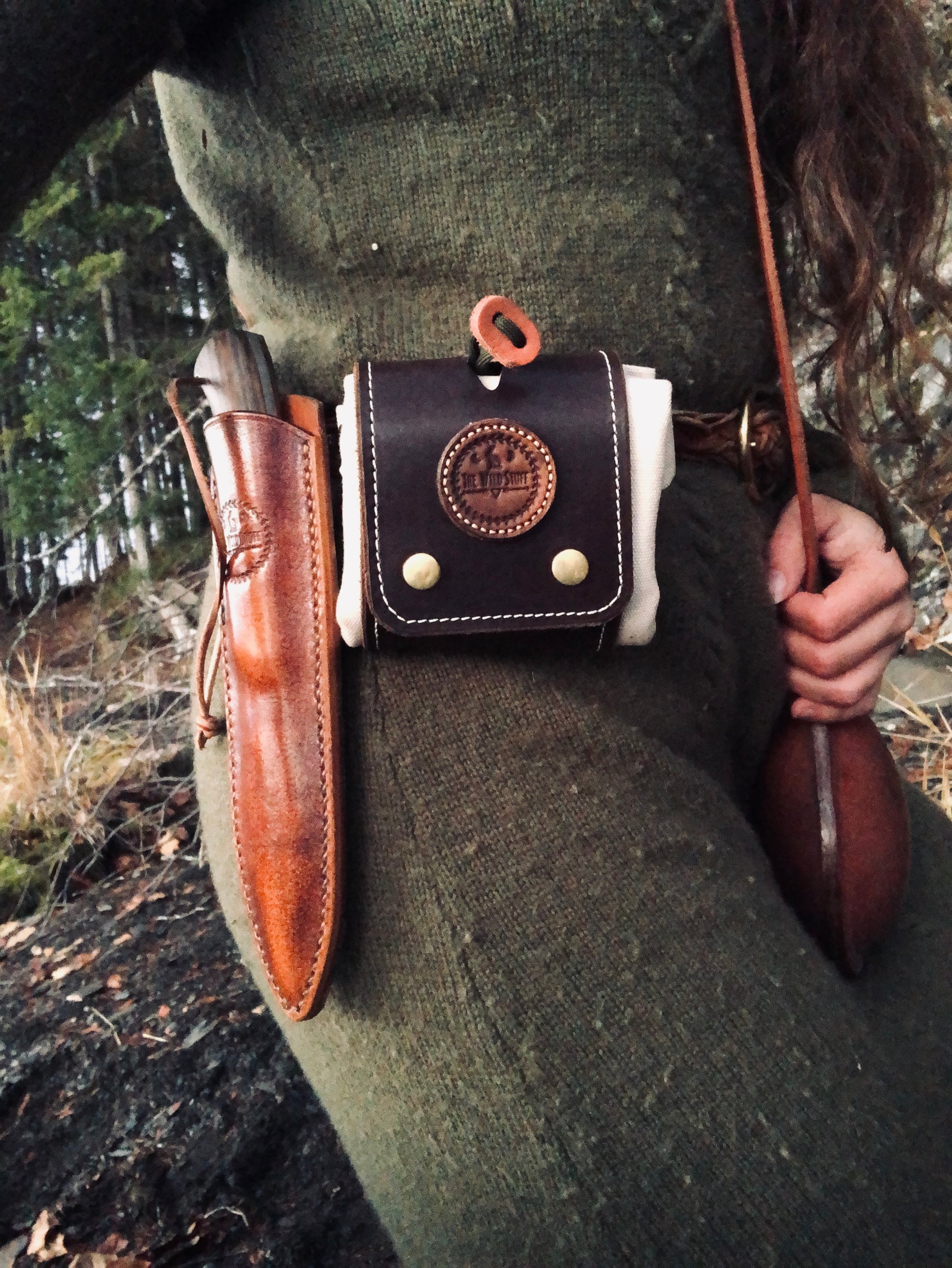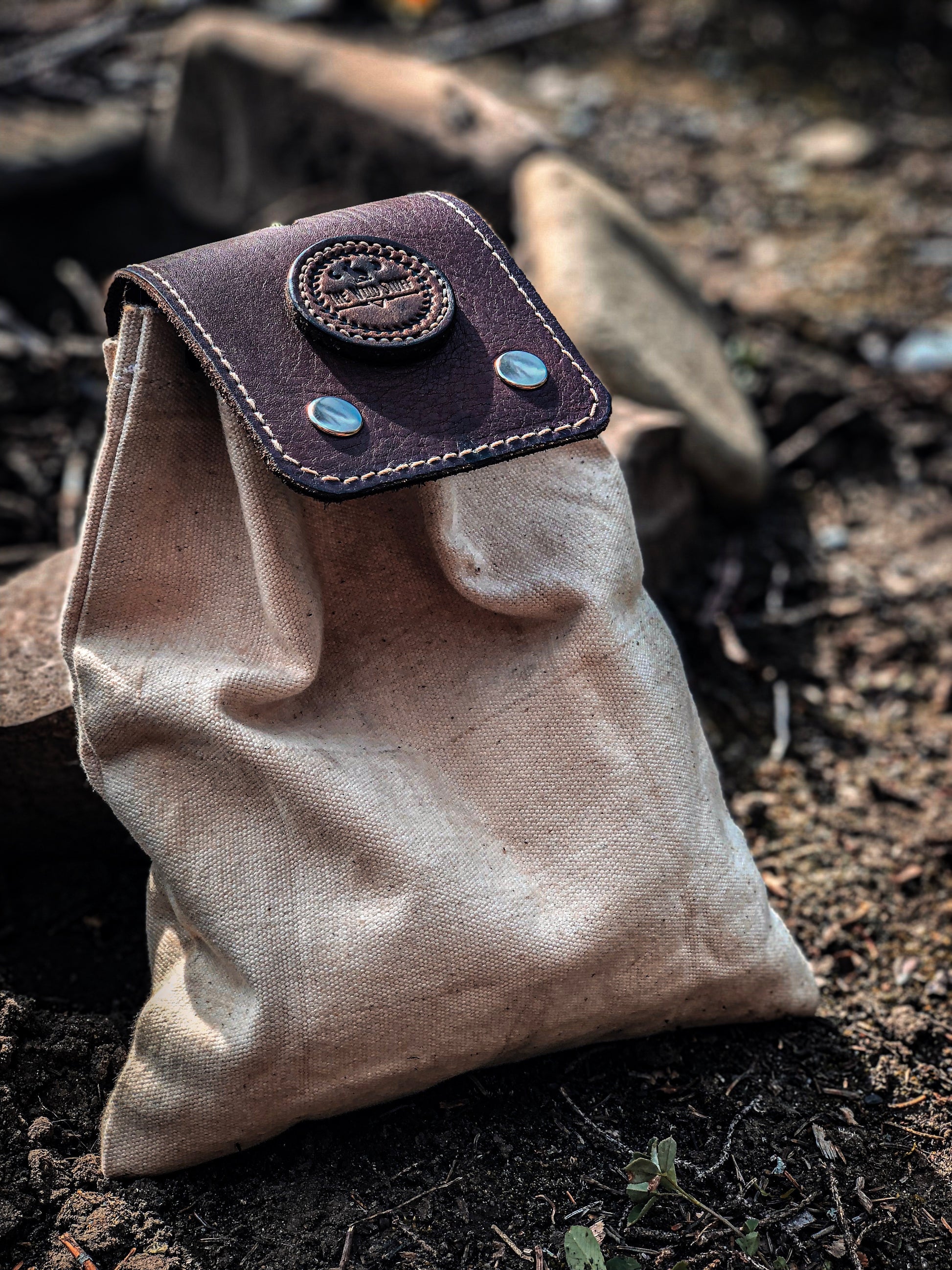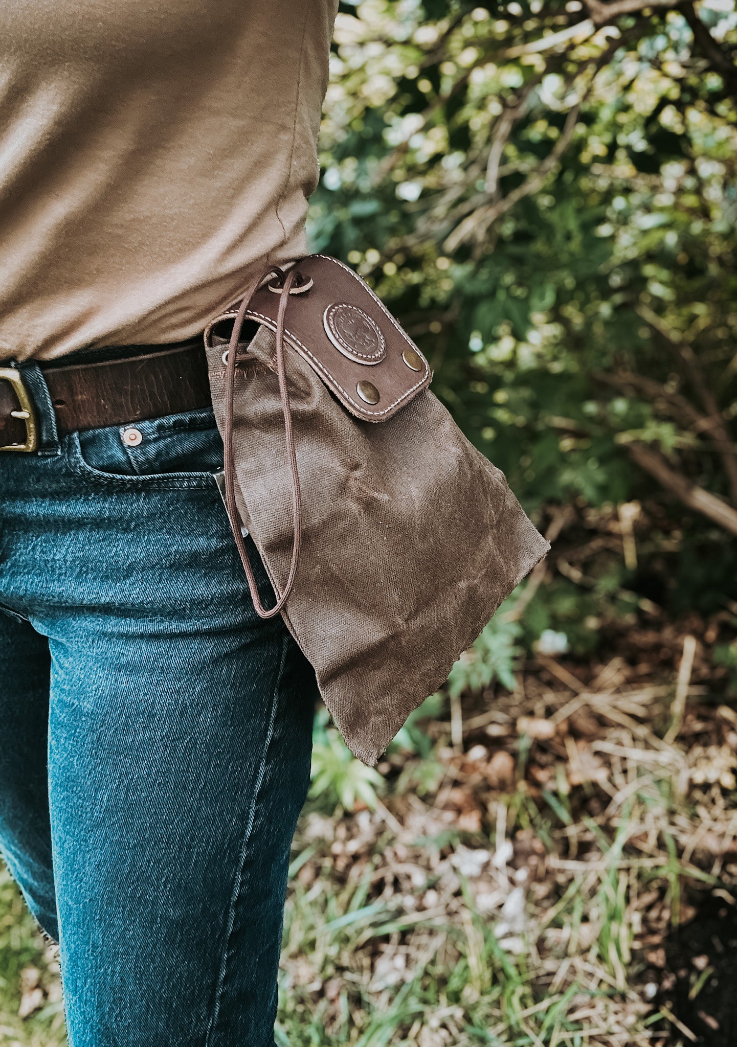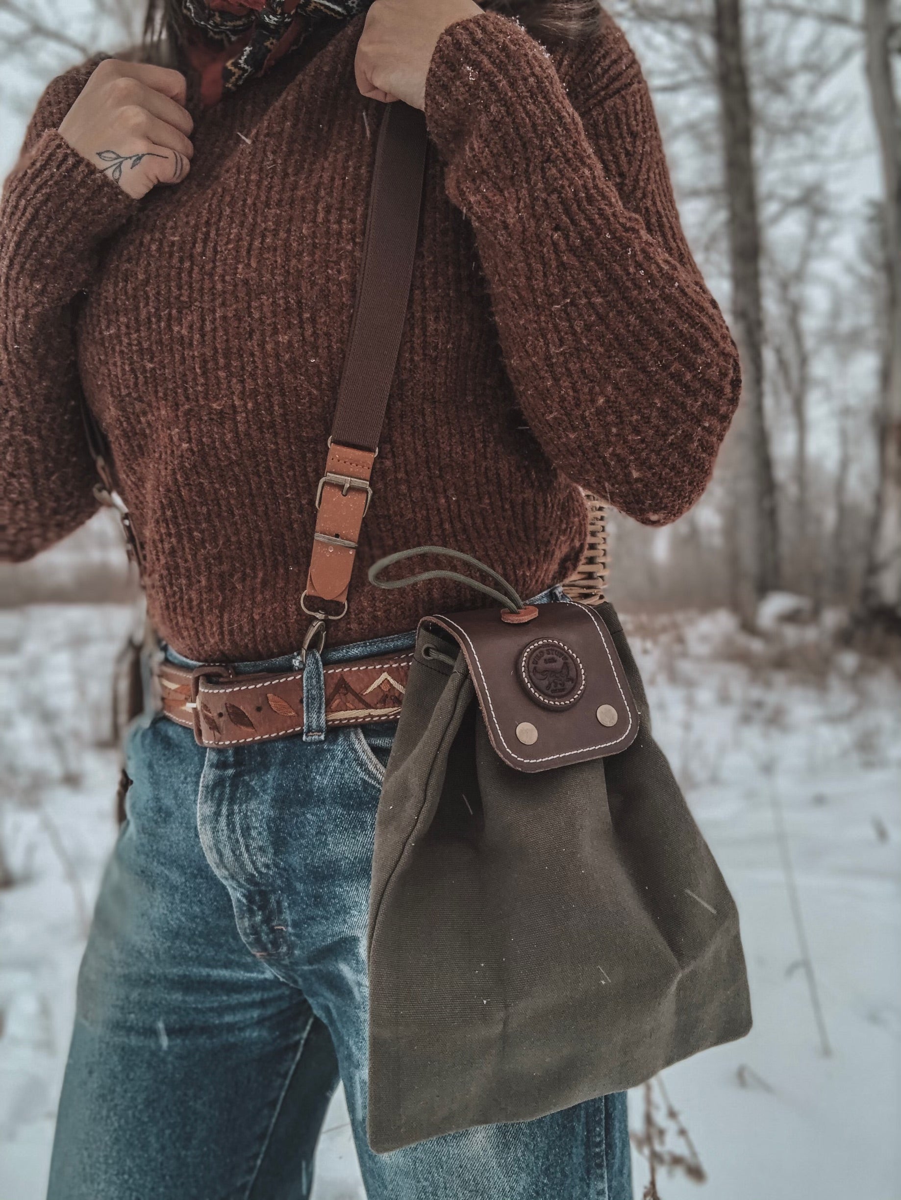 Our canvas and leather foraging tote is a must for any adventure to the sticks. With its highly functional and practical design it helps to keep your wild goods dry, neat, and easily accessible. Made with 100% waxed cotton canvas, its sure to stand up to the wildest excursions. Hand stitched and paneled with genuine leather, its top quality and durability will last a lifetime. Equipped with belt clip to allow for easy wearing and removal while foraging. Cordage drawstring to help close and keep bag secure and tight. Folds neat and tight to wear without bother.