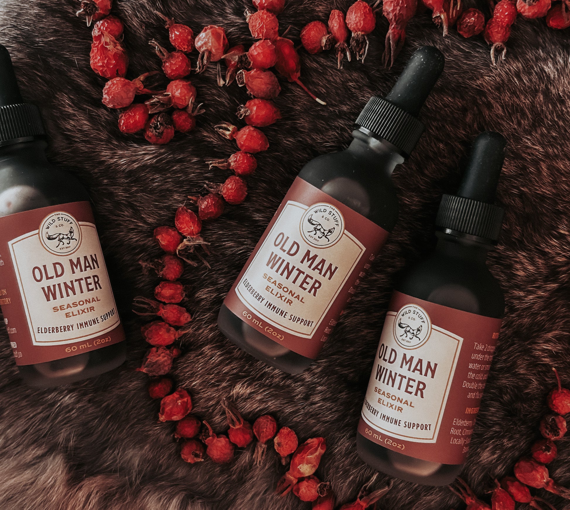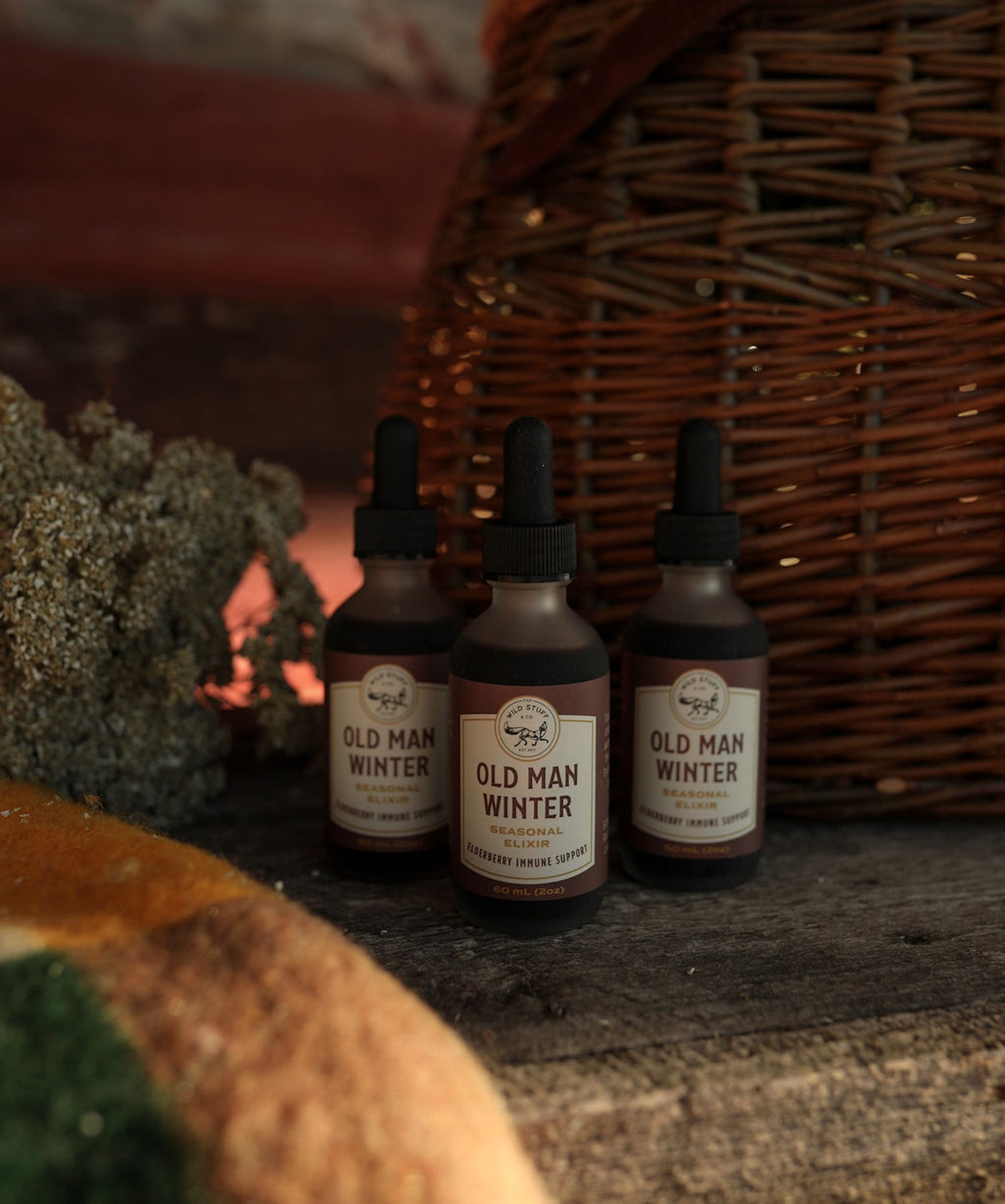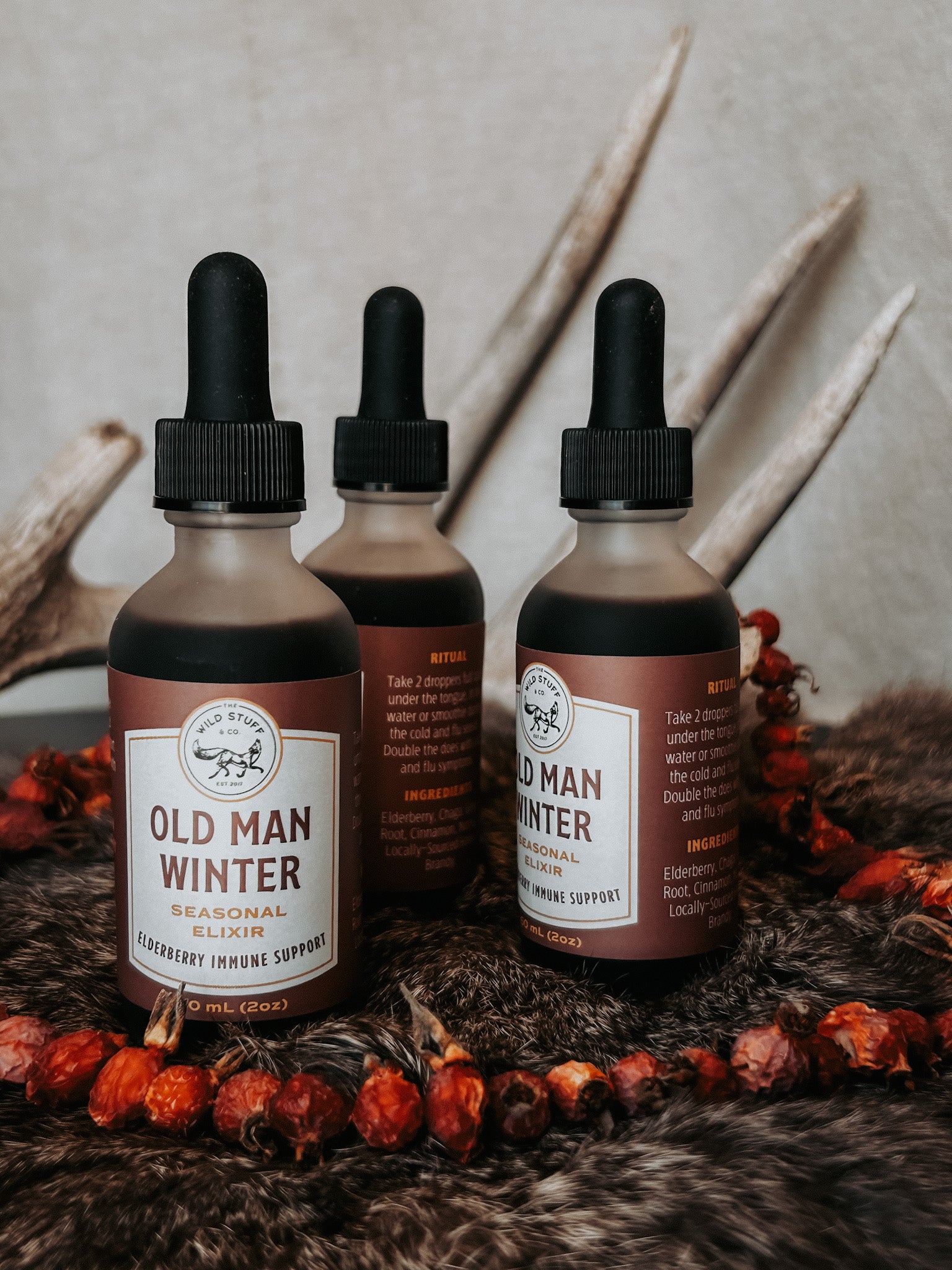 The Old Man Winter Elixir is a potent immunity building tonic, a must have for the medicine cabinet. Its a warming blend of ginger, chaga, and elderberries. The perfect remedy to add to your fall and winter rituals of self care and love. Let it be your ally to the cold and flu season.