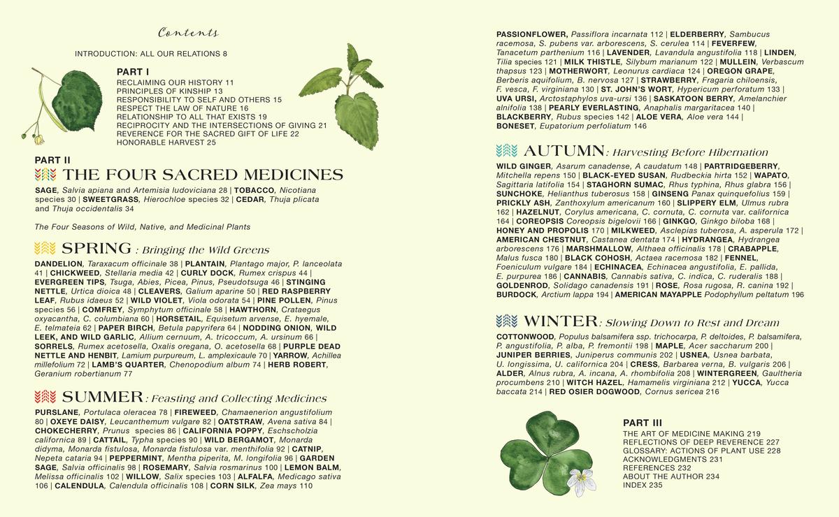 The second part of the book is filled with insightful illustrated plant profiles detailing the identification, uses, and Indigenous folklore of some of the continent’s most treasured ancestral plants. Included are edible and medicinal bark, berries, and buds from trees and shrubs, as well as foliage, flowers, and fronds from herbs, “weeds,” and wildflowers; some native to the continent, others introduced generations ago.